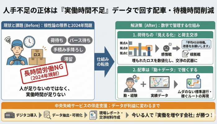 「ドライバーが足りない」。この言葉を聞き飽きた会社も多いでしょう。でも本当に足りないのは“人数”だけではありません。実は多くの現場で、“実働時間”が足りていないのです。運転していない