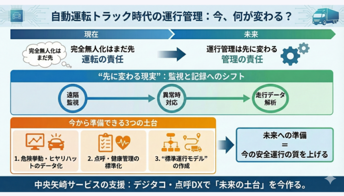 自動運転トラックは来る。じゃあ運行管理はどう変わる?自動運転の話題は、現場で温度差が出やすいテーマです。「まだ先だ」と笑う人もいれば、「仕事がなくなる」と構える人もいる。結論を先に言うと、完